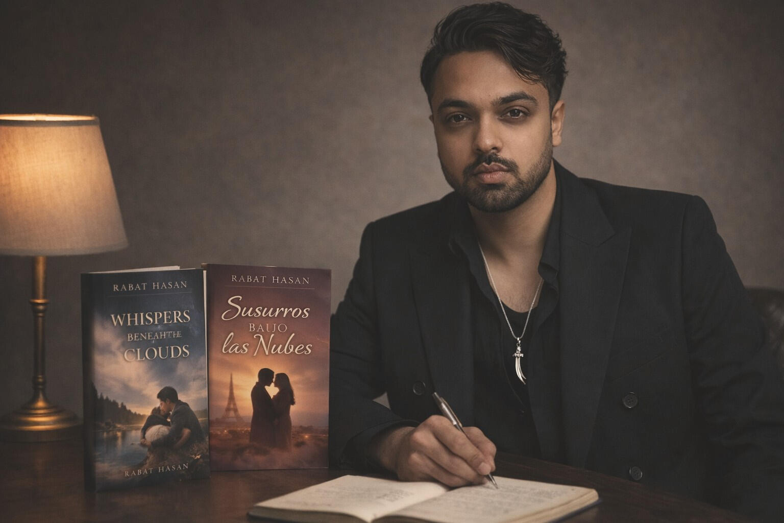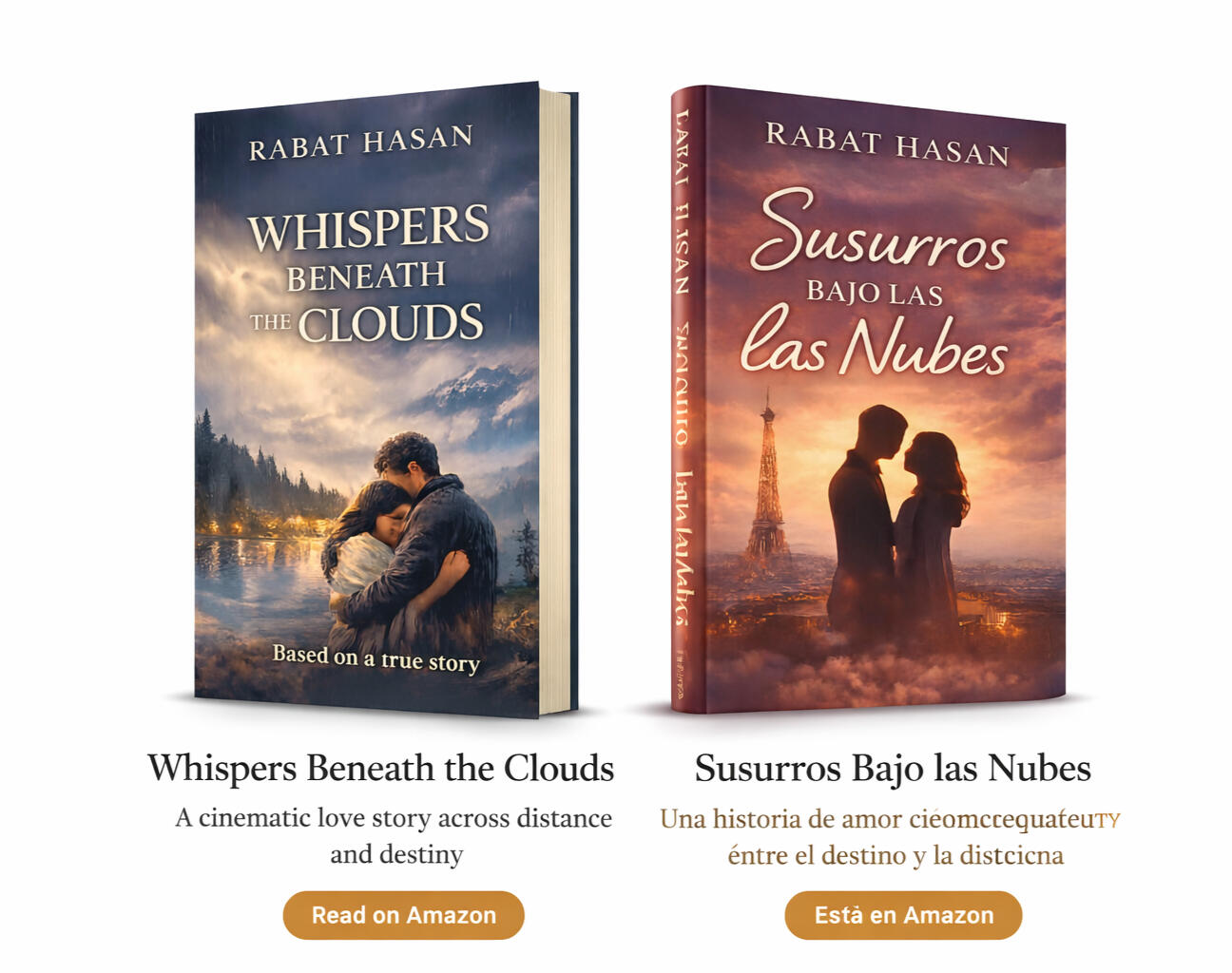 Rabat Hasan is a contemporary literary novelist exploring love across borders, memory shaped by distance, and the quiet force of destiny.His debut novel Whispers Beneath the Clouds — and its Spanish edition Susurros Bajo las Nubes — reflect a deeply cinematic journey of longing, resilience, and connection.Entre dos mundos y dos idiomas, Rabat escribe historias donde el amor no conoce fronteras — donde la memoria susurra incluso bajo las nubes.Currently based in Canada, he writes for readers who believe that some stories are meant to travel beyond language.
